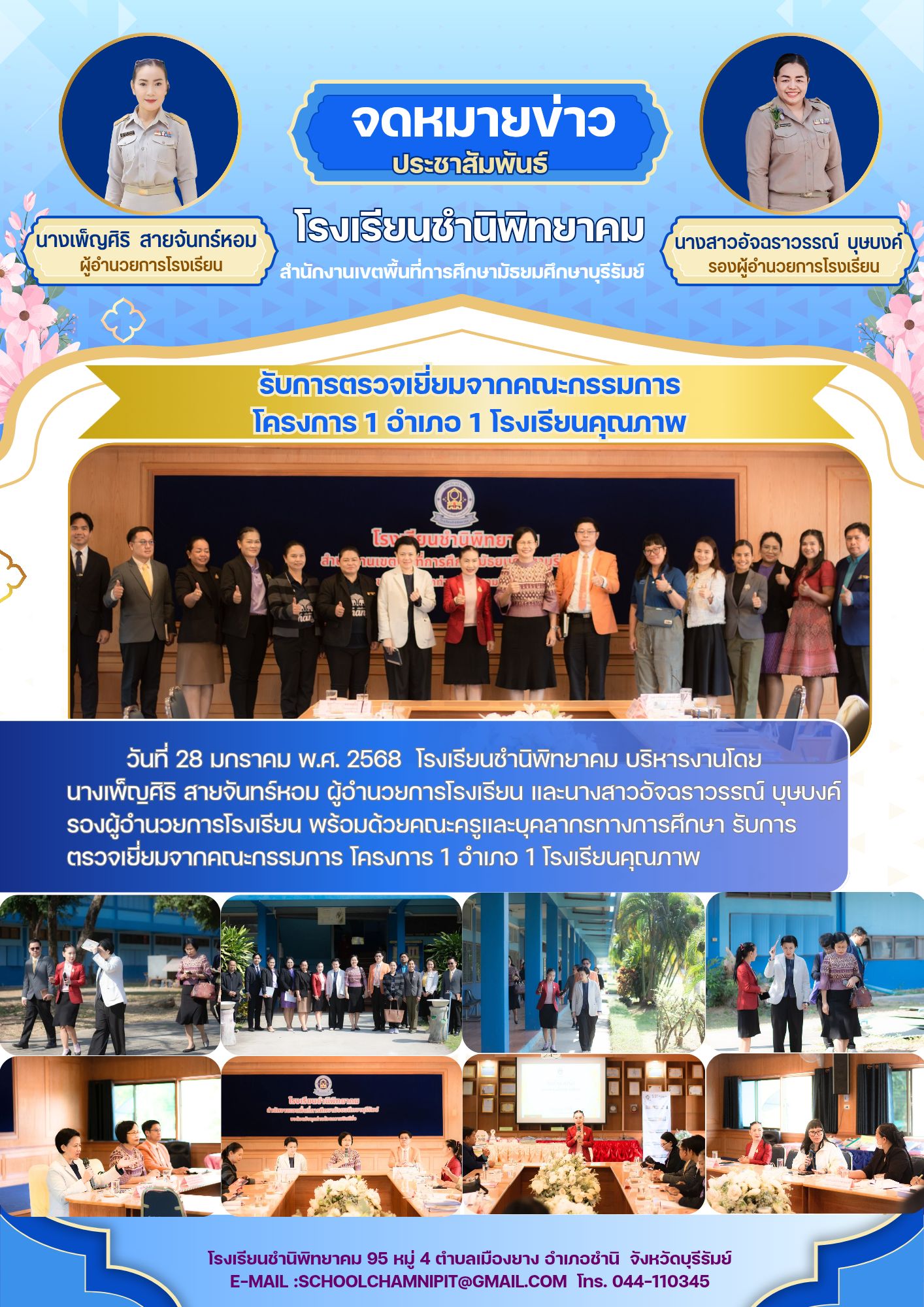 วันที่ 28 มกราคม พ.ศ. 2568 โรงเรียนชำนิพิทยาคม บริหารงานโดย นางเพ็ญศิริ สายจันทร์หอม ผู้อำนวยการโรงเรียน และนางสาวอัจฉราวรรณ์ บุษบงค์ รองผู้อำนวยการโรงเรียน พร้อมด้วยคณะครูและบุคลากรทางการศึกษา รับการตรวจเยี่ยมจากคณะกรรมการ โครงการ 1 อำเภอ 1 โรงเรียนคุณภาพ